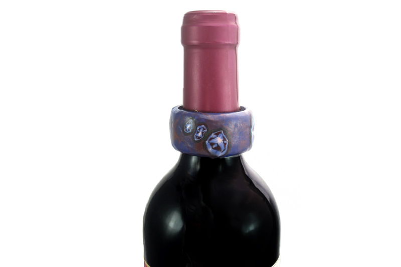 Aro recogegota de vino Rodines. Decorado con un diseño elaborado de forma totalmente artesanal con arcilla polimérica. Para llegar a este resultado, se combinan arcillas de diferentes colores y en distintas proporciones. En esta creación he utilizado distintas técnicas artesanales como son el laminado, amasado y la composición de distintas capas. Todo ello da lugar a un complemento único e imprescindible para los amantes del vino y de la elegancia en la mesa.
