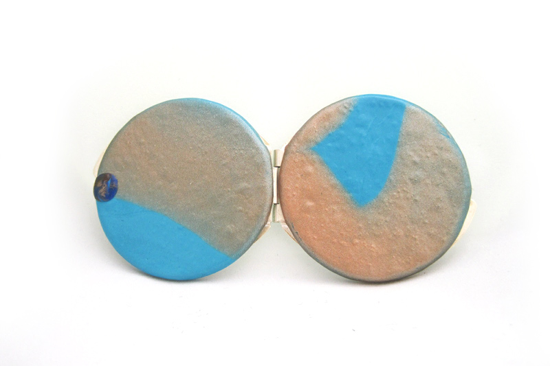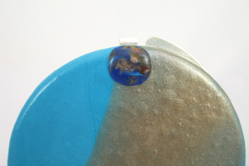 En contra de lo que pueda parecer, no hay nada pintado en el espejo. En este caso he utilizado arcilla turquesa y varios tonos de oro metalizados. Estos se van fusionando poco a poco, hasta fundirse de una forma mágica. En el cierre tiene un pequeño detalle abstracto en varios tonos de azule y dorados.