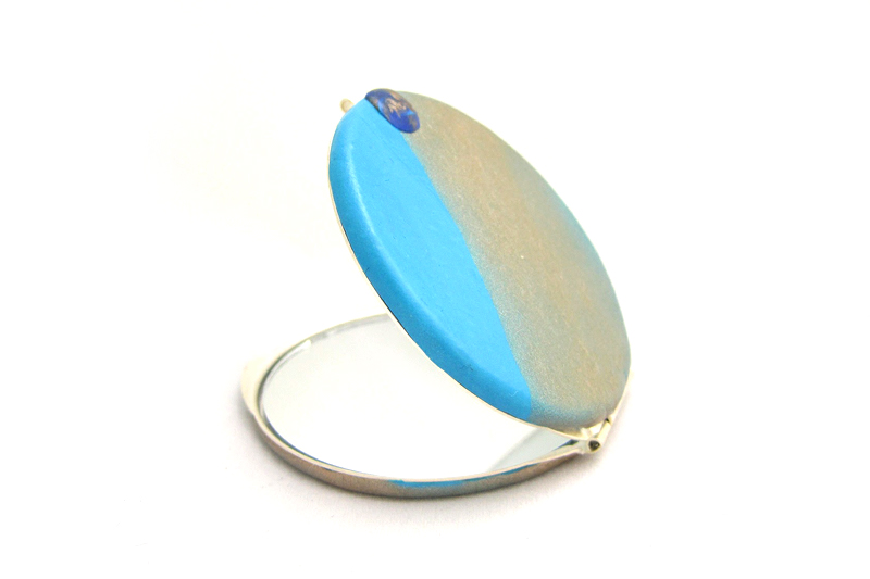 Espejo doble de bolso Sand, elaborado artesanalmente con todo el cariño, mimo y cuidado de los detalles que requiere la creación de artesanías de este tipo. El material utilizado para la creación del diseño es arcilla polimérica sobre una base metálica. El espejo consta de uno normal y un espejo de aumento, ideal para cuando necesitamos mas precisión.