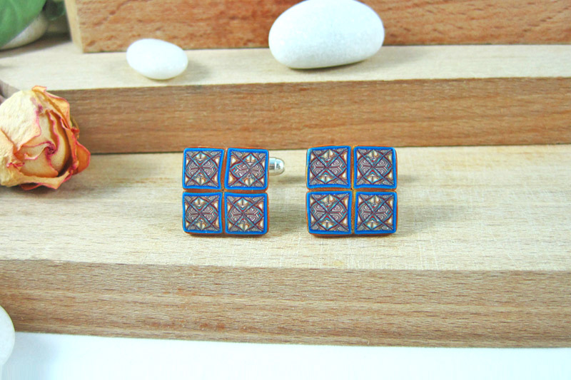Gemelos hechos a mano con arcilla polimérica con un diseño que se parece a el de una vidriera. Está montado sobre una mancuerna giratoria bañada en plata.